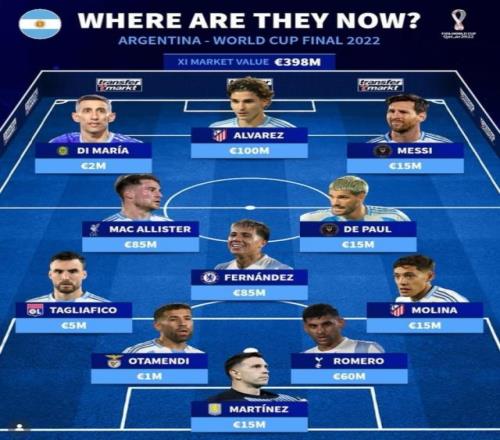 12月19报道 阿根廷在3年前赢得了世界杯冠军,《转会市场》也追踪了阿根廷决赛首发11人的当前情况。