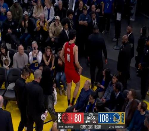 在比赛进行到第四节时,让中国球迷揪心的一幕出现了:杨瀚森在一次进攻中积极拼抢,但后脑勺不慎撞到了勇士后卫威尔-理查德膝盖,痛苦倒地。随后开拓者的队医进行检查后让其返回更衣室进行检查。