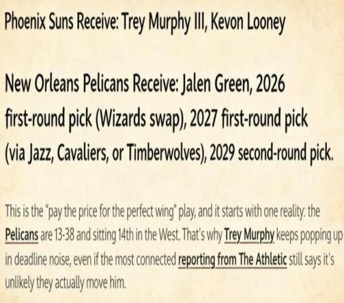 美媒《Fadeaway World》撰文提议,太阳应该打包杰伦·格林、2026年的首轮签(奇才互换权)、2027年首轮签(来自爵士、骑士或森林狼)以及2029年的次轮签送到新奥尔良,换回鹈鹕前锋墨菲。