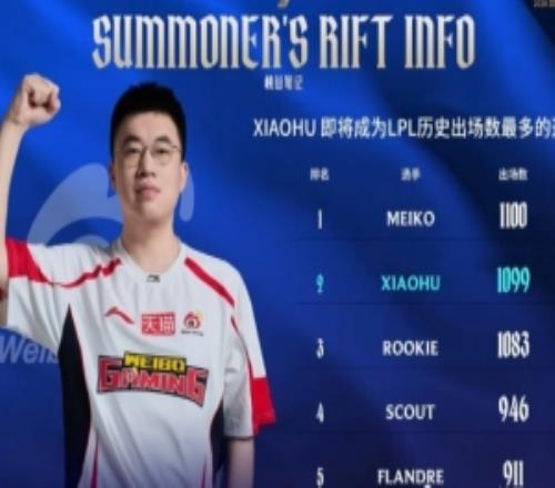 里程碑:Xiaohu达成1100出场成就LPL第2位选手! -
